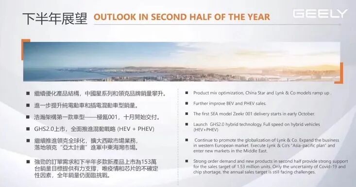 虽然下半年还有全年60%的销量压力在身,但吉利汽车CEO淦家阅表示不会调整153万辆的年度目标,“这与2021年整个产品结构规划相关,吉利汽车下半年有多款新车要上市,新产品将带来新的增量”。