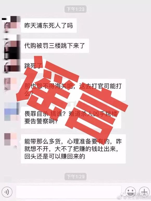 8月11日下午起,微信群中流传一女子因代购被处罚后在浦东机场跳楼坠亡并配发截图及照片。
