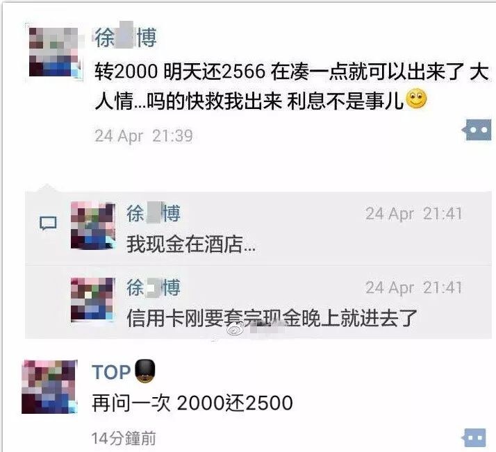 不久,徐某博的朋友圈除了炫富外,又多了一个主题——借钱。据爆料人称,徐某博每天发朋友圈借钱,并且用和他人的聊天截图证明自己:借1000元,隔天就还1500元;借3000元,隔天就还3500元。