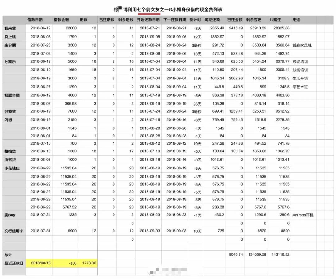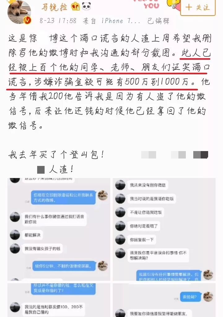 爆料人称,徐某博还用各种理由向各种人借钱,发小、同学、朋友、女友、刚加的网友、校内撩的妹、人人撩的妹、陌陌撩的妹、探探撩的妹、微博撩的妹、酒吧门口撩的妹、机场撩的妹甚至专车司机。