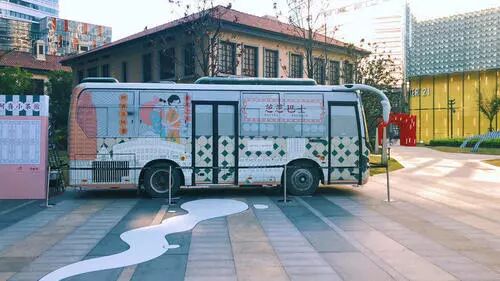 这是喜茶租用并重新装饰的“芝芝巴士”,巴士内摆放了留声机、立式麦克风与老旧皮箱等道具,充满了老上海的情调。