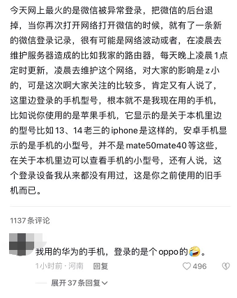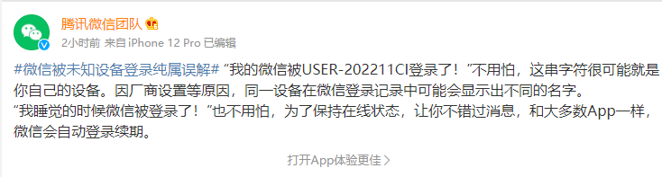 微信被未知设备登录纯属误解!回应显示:“我的微信被USER-202211CI登录了!”不用怕,这串字符很可能就是你自己的设备。因厂商设置等原因,同一设备在微信登录记录中可能会显示出不同的名字。“我睡觉的时候微信被登录了!”也不用怕,为了保持在线状态,让你不错过消息,和大多数App一样,微信会自动登录续期。![]()