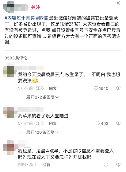 “甘肃青海两地好多网友发现自己的微信在其他设备上莫名其妙被登录过了,不晓得怎么回事。”“郑州地区的微信也被莫名其妙的设备登录了。”“我的昨天晚上7点多登录过,我在睡觉啊。”