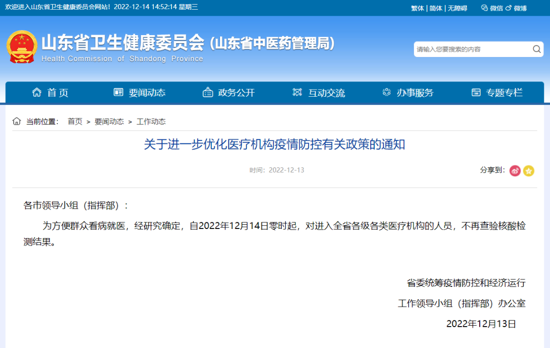 12月13日,山东省卫健委官网发布《关于进一步优化医疗机构疫情防控有关政策的通知》,《通知》提出,为方便群众看病就医,经研究确定,自2022年12月14日零时起,对进入全省各级各类医疗机构人员,不再查验核酸检测结果证明。