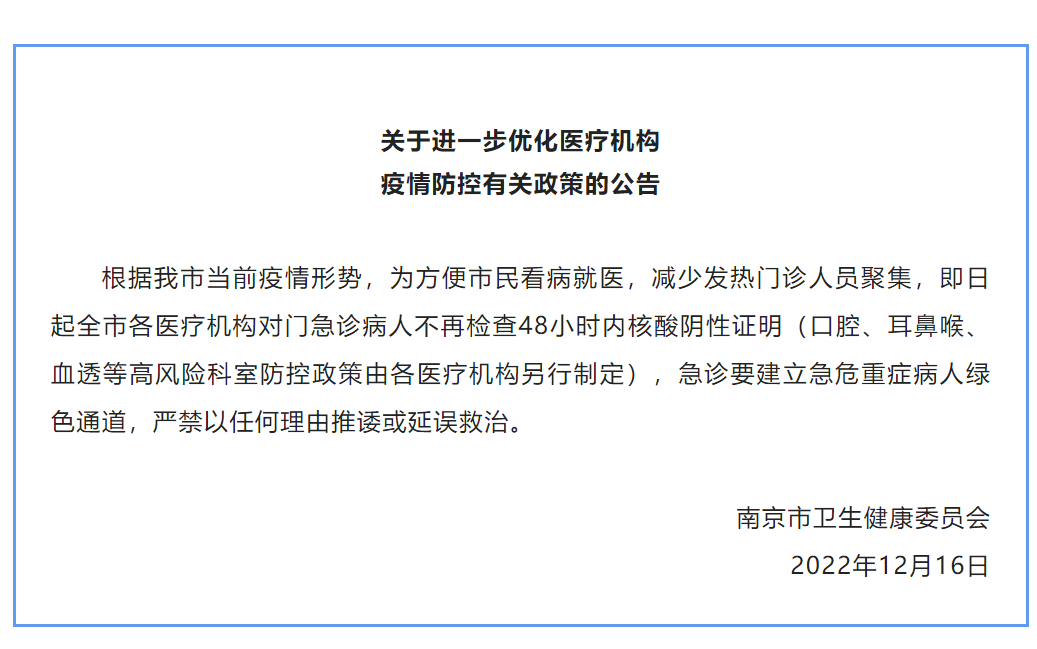 12月16日,南京发布《关于进一步优化医疗机构疫情防控有关政策的公告》,公告称,根据该市当前疫情形势,为方便市民看病就医,减少发热门诊人员聚集,16日起南京各医疗机构对门急诊病人不再查检48小时内核酸阴性证明(口腔、耳鼻喉、血透等高风险科室防控政策由各医疗机构另行制定)。急诊要建立急危重症病人绿色通道,严禁以任何理由推诿或延误救治。