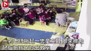 视频显示,一名女老师,突然揪起一名身穿黄色衣服的男童左耳,把他带到教室前方。