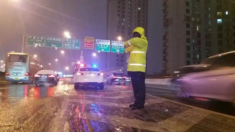 杨浦交警冒雪在军工路翔殷路口指挥交通