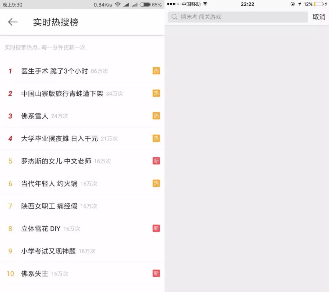 目前微博有3亿多月活用户,微博热搜榜产品报告称,2016年每日用户主动搜索2.5亿次,引导1.35亿搜索热度,在搜索结果页创造33亿微博曝光机会;80%的用户每月15天以上使用搜索获取信息,每人日均搜索超过12次。因此,“热门搜索”的位置便格外重要。