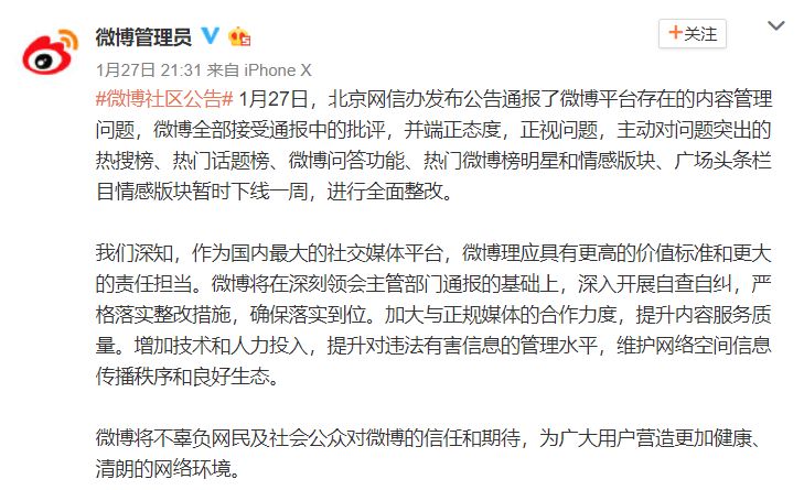 新浪微博负责人表示,将严格落实网信部门管理要求,对问题突出的热搜榜、热门话题榜、微博问答功能、热门微博榜明星和情感版块、广场头条栏目情感版块暂时下线一周进行整改。
