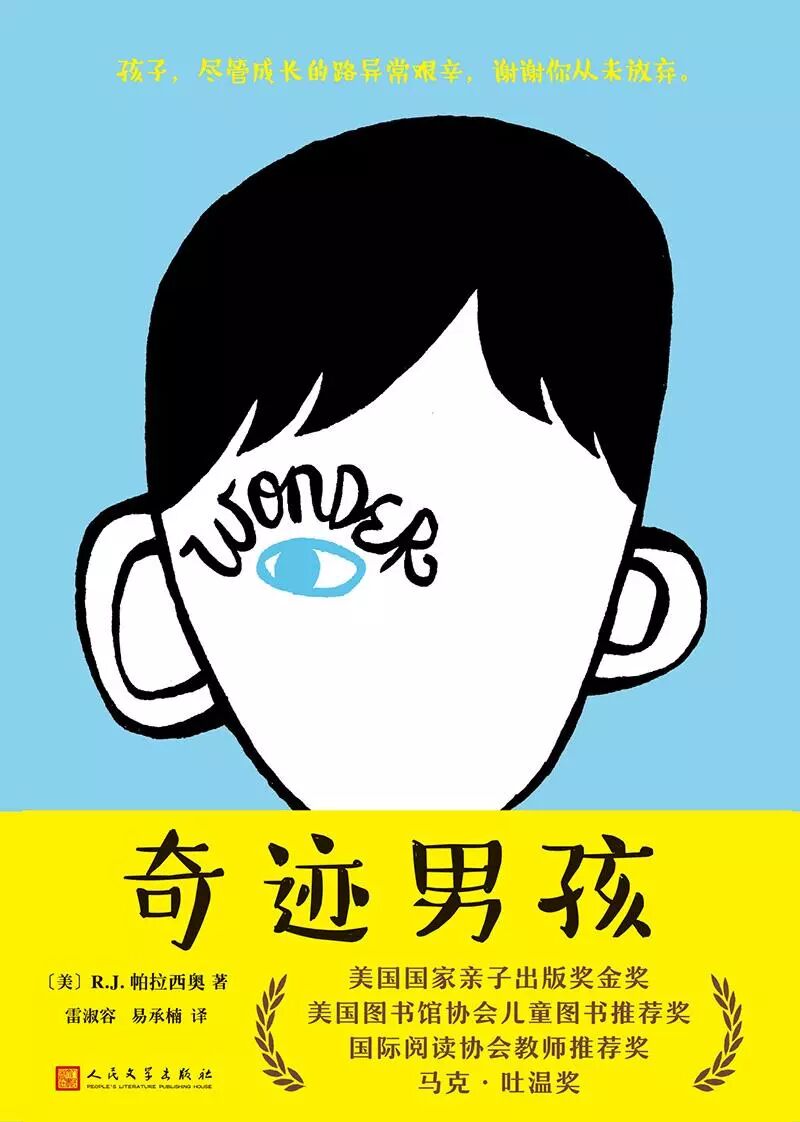 这也许是唯一一本全世界各语言版本都使用了同一封面元素的书,蓝色底色上是一张孩子脸,只看得到一只浅蓝色的眼睛,眉毛是英文wonder(奇迹)。