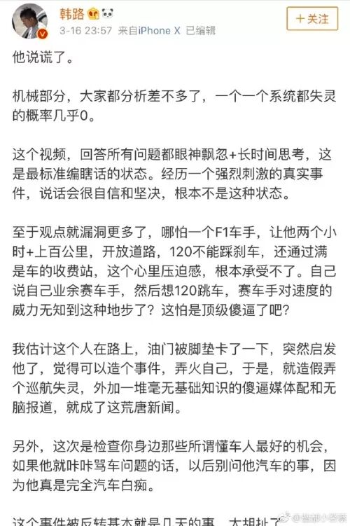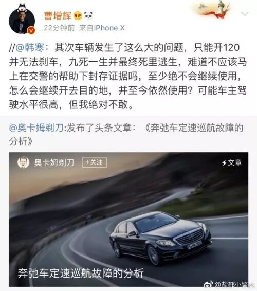 资深车评人@韩路 说奔驰车主说谎,并分析了当事人录视频时的微表情。