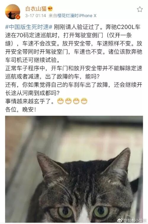 交警:“15日,他和我说,通过后台操控,他解开了安全带,然后打开了车门,定速巡航从每小时120公里逐渐降到每小时30公里,然后在降速的过程中,他多次踩刹车,到30码的时候这个刹车管用了。16日下午,他否认了这个后台操控,他说这跟后台没啥关系。他说他心里想着停下来可能是因为手机下载了一个东西,APP什么,然后可能和奔驰售后后台是连接的。我问他具体采取了哪些措施,他说就是解开安全带,打开车门,然后这个车速降下来了。”