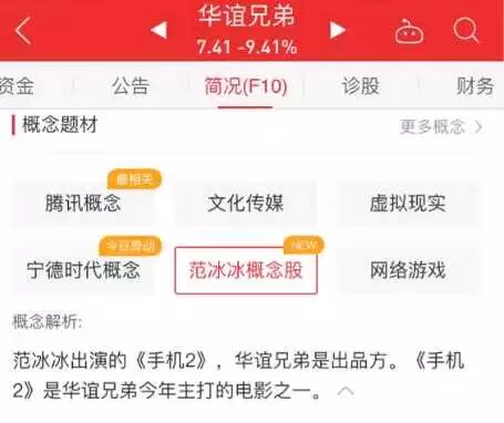 而华谊兄弟旗下,居然还有一个范冰冰概念股!这不跌都觉得难以置信。