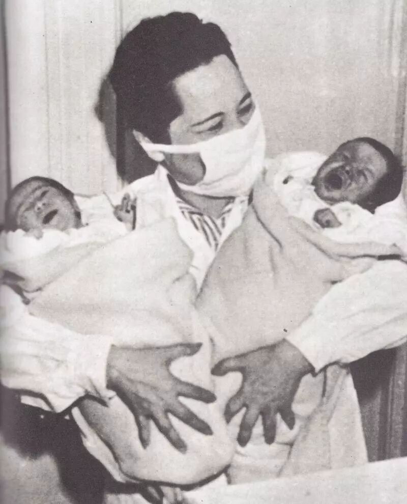 1955年春,宋庆龄视察中国福利会国际和平妇幼保健院,怀抱着一对孪生婴儿。