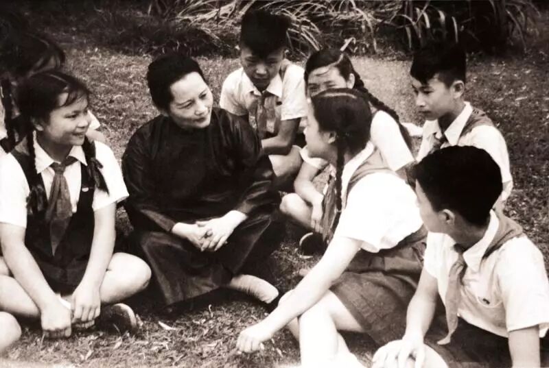 1952年,宋庆龄和中国福利会儿童艺术剧院的孩子们在草坪上促膝谈心。