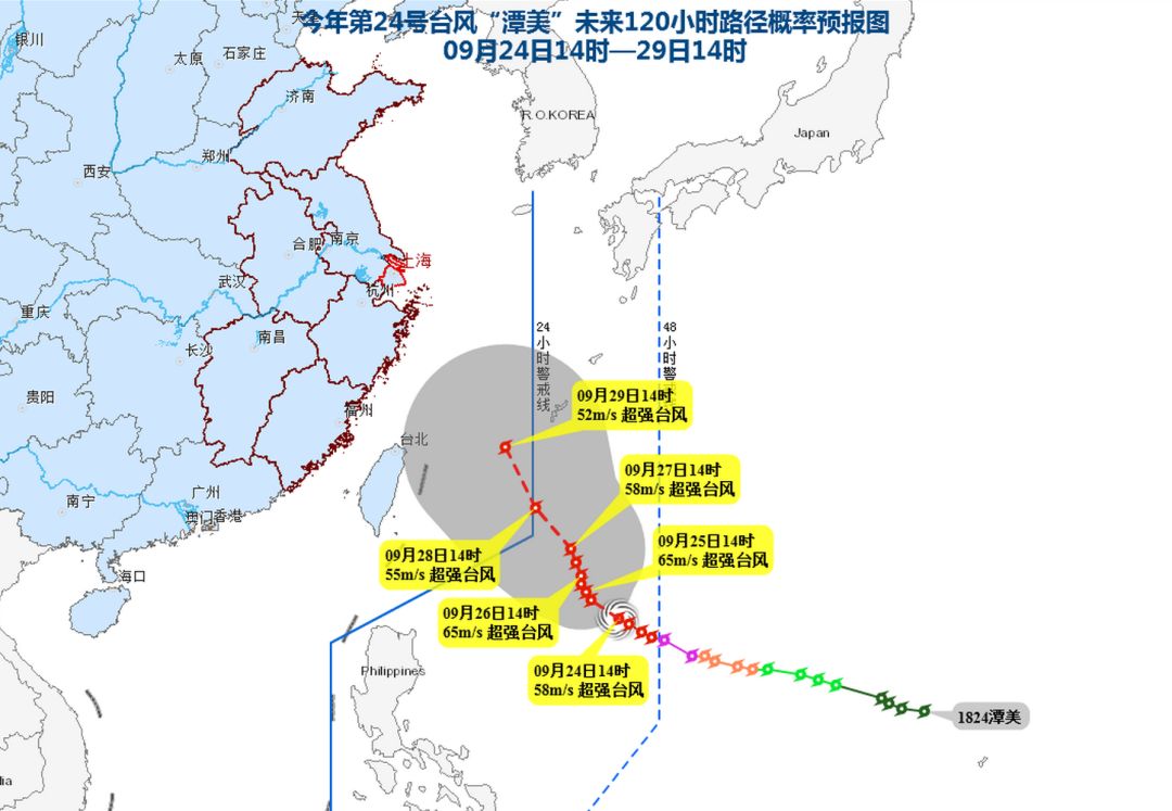 根据中央气象台预报,今年第24号台风“潭美”在9月24日5时加强成为超强台风,强度还将有所加强。它已经成为今年继杰拉华、玛莉亚、飞燕、山竹之后第5个超强台风。