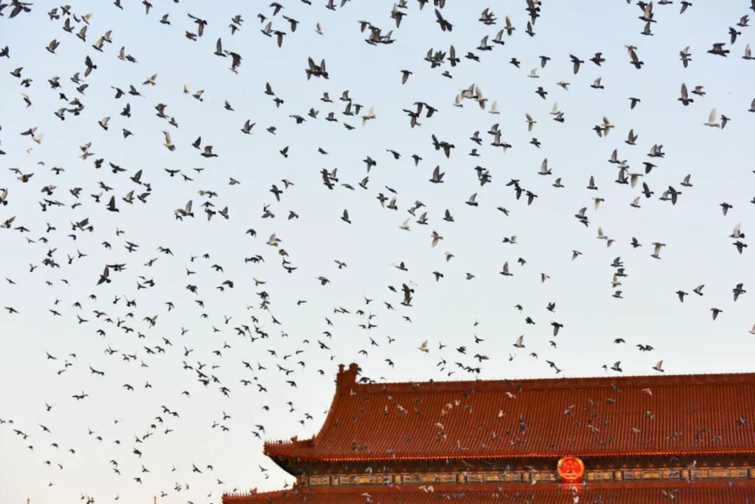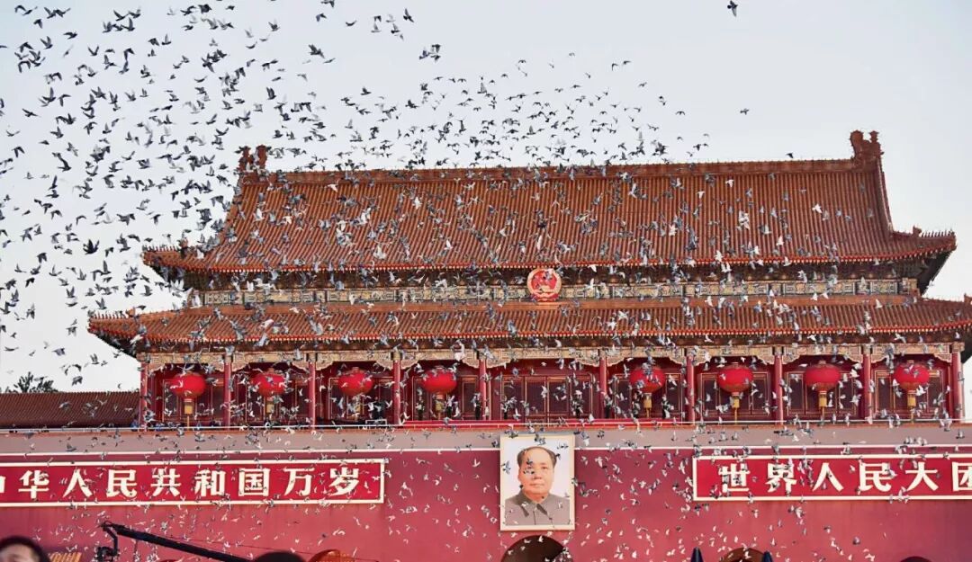 随着国旗升至旗杆顶端,1万羽和平鸽翱翔蓝天,绕着广场盘旋,广场上爆发出热烈的欢呼声,人群中响起了热烈的掌声和“祖国万岁”的欢呼声。
