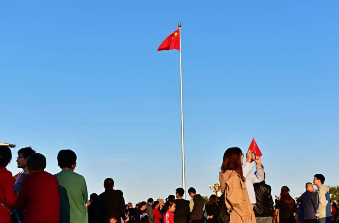 天微微亮,太阳露出了红色的面庞,天安门广场上,人群逐渐安静了下来,人们都不时低头瞅一眼时间,屏息期待等待已久的升旗时刻。