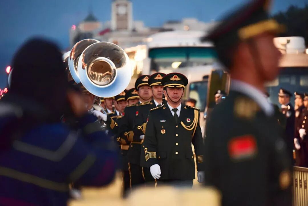 出金水桥后,96名护旗队员由齐步换正步,端枪护卫国旗行进。铿锵有力的正步足音激荡在观众耳畔,这是中国军队迈向崭新未来的坚定步伐,彰显着中国军人的气质和风貌。护旗环节由原来的肩枪改为端枪,这一动作象征着既护卫着国旗,也向国旗敬礼。
