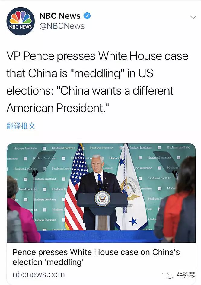 副总统彭斯说中国正在干涉美国选举