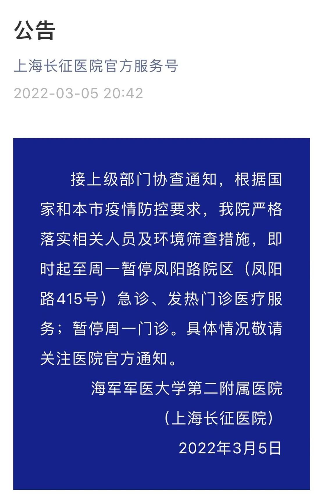 3月5日晚,上海长征医院官方服务号发布公告,接上级部门协查通知,根据国家和本市疫情防控要求,海军军医大学第二附属医院(上海长征医院)严格落实相关人员及环境筛查措施,即时起至周一暂停凤阳路院区(凤阳路415号)急诊、发热门诊医疗服务;暂停周一门诊。具体情况敬请关注医院官方通知。