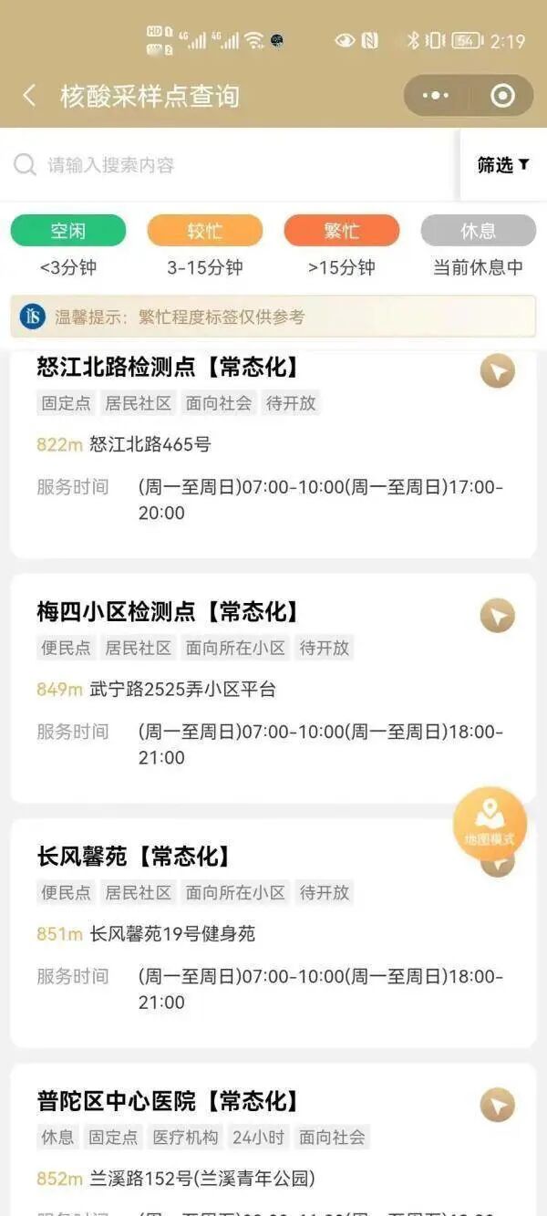 首先,市民可以通过随申办APP,支付宝、微信随申办小程序进入“核酸采样点”查询系统,查询点位地址、类型、服务时间、忙闲状态等,并可进入电子地图模式进行位置导航。![]()
