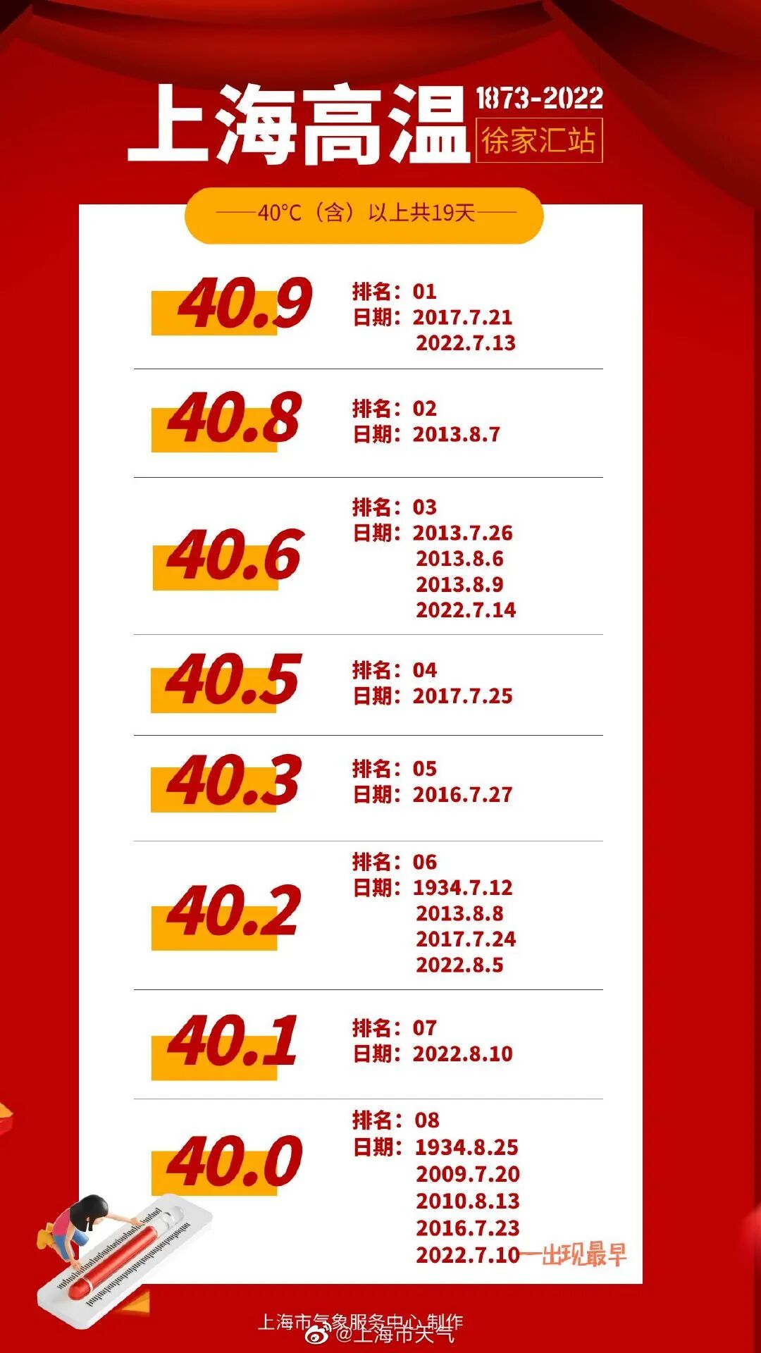 截至今天,今年超过40℃的极端酷热天气已达5天,持平2013年,是徐家汇站自1873年有正式气象记录以来的第一位。