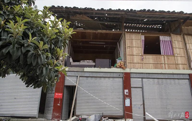 地震导致房屋损坏。王峰供图夫妻俩逃出来后,第一反应就是要去接孩子。小女儿4岁,就在几百米外的幼儿园上学,夫妻俩跑到学校接上小女儿后,又赶紧发动汽车,去几公里外的小学接大女儿。一路上,许多地方出现了山体滑坡,车子根本开不过去。情急之下,夫妻俩跳上了一辆路边借来的电瓶车赶到了学校,此时9岁的大女儿已经在校门口泣不成声。“还好镇上大部分房子都是汶川地震以后建起来的,都还是有抗震设计的,都没有倒塌。”店主王峰到达广场上后,他发现那里已经汇集了上百个人。此时,他想给家里人报平安,但手机没有信号。大约1个多小时后,各路救援部队赶来。政府发放了大帐篷,包括王峰在内的青壮年全都帮忙去搭帐篷。