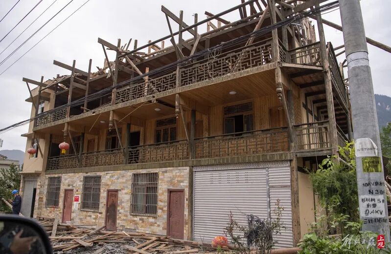 地震后,塌陷的大西映画酒店。受访者供图另一家民宿老板李西曼是从头顶晃动的白炽灯感受到地震的。震感来的猝不及防,李西曼还没有看到手机弹窗,就被闪烁的灯光吓了一跳,“那一瞬间脑子里还懵懵的,反应过来时人已经下意识往外跑了”。人在地上站不稳,砖石砌起的承重墙也开始出现裂缝。李西曼跑出民宿,发现不少人拉着老人孩子,也手忙脚乱地跑出来。“磨西古镇还是老年人和孩子居多,大家互相搀扶着,跑到临近的小广场上”,李西曼说。他附近的房屋并没有大面积倒塌,也没有人员伤亡,“是不幸中的万幸”。经营火锅店的陈希没有那么幸运。地震时,她还在睡觉。逃出家门后才发现,店里二层的楼顶全都塌了,“现在就是一个通天的破房子了,瓦片掉了一地。”