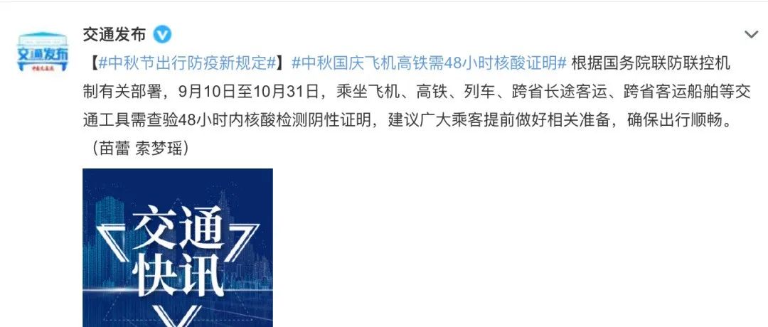 二是安全有序出行。9月10日至10月31日,旅客须持48小时内核酸检测阴性证明乘坐飞机、高铁、列车、跨省长途客运汽车、跨省客运船舶等交通工具。