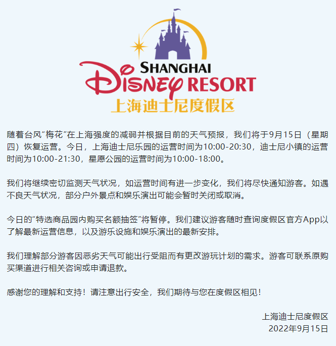 均提供正常运营服务随着台风“梅花”在上海强度的减弱并根据目前的天气预报,我们将于9月15日(星期四)恢复运营。今日,上海迪士尼乐园的运营时间为10:00-20:30,迪士尼小镇的运营时间为10:00-21:30,星愿公园的运营时间为10:00-18:00。我们将继续密切监测天气状况,如运营时间有进一步变化,我们将尽快通知游客。如遇不良天气状况,部分户外景点和娱乐演出可能会暂时关闭或取消。虽然风雨渐小,不少市民反映: