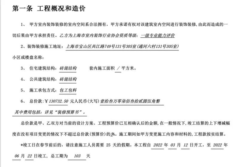 2022年2月28日,同样怀揣着“拎包入住”的美好期待,二人在位于黄浦区的某整装公司签下了施工合同,敲定合同价格为13万,工期103天,“当时想的,就是省心省力地完成老房子的翻新。”然而,装修过程中遇到种种问题,如今距原定工期更已逾三个多月,童先生不得不向“解放日报·上观新闻”留言板求助。