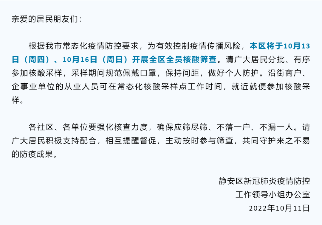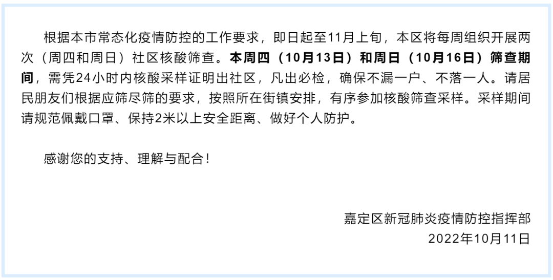 为进一步巩固疫情防控成果,有效控制疫情传播风险,根据国家和本市疫情防控要求,结合本区防控需要,定于10月13日(周四傍晚)、10月14日(周五傍晚)增加两次全区全员核酸筛查。核酸采样时间:10月13日和10月14日17:00-22:00。采样时段实行封闭管理,采样结束后即解除封闭。具体以所在街镇(工业区)居村通知为准。
