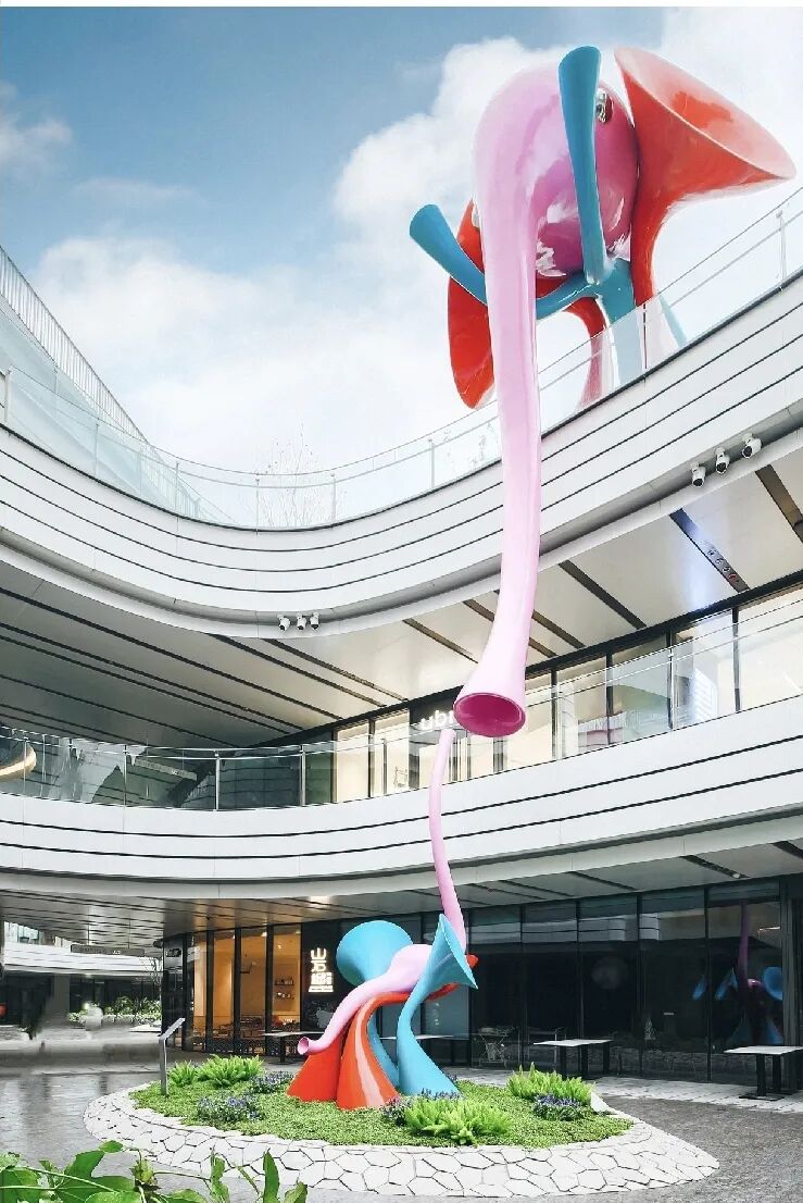 与传统目的性消费导向的空间规划不同,区域腹地将多元化的建筑空间分为东里及西里,在开放绿地公园上架起了285米长的天桥连廊,商业和绿地面积近乎平分秋色。