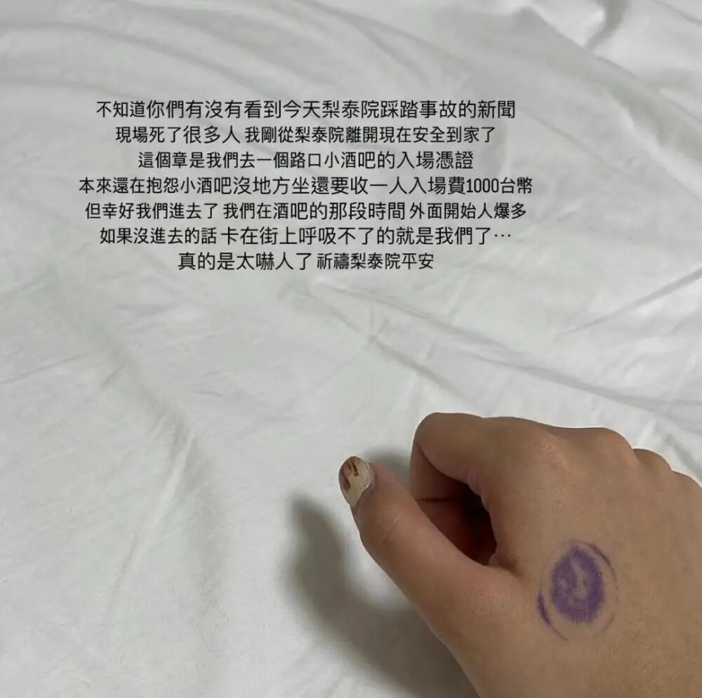 在首尔,万圣节去梨泰院是一种约定俗成。在韩留学的周芸表示,“梨泰院是韩国最繁华的商业区之一,万圣节出去玩的话,大家都会想到那边逛一逛。”或许是因为三年间疫情的封锁,人们分外渴望这次节日——当晚,在这条长约1.4公里、倾斜的市中心街区,竟然流入将近10万人。危险蕴含在狂欢之中。中国留学生周芸大约是当晚19时左右到达梨泰院的,“人比往年要多得多,特别挤的地方脚都不用沾地,直接就被推着走。”她和朋友两个人来到了酒吧街附近,试图往里走,“实在是进不去,我挤了两趟都没成功。”胸膛贴着胸膛,混杂着刺鼻的香水味,人群的强大力量挤压着她,“我当时觉得我都要窒息了”。待了一个小时左右,她和朋友选择离开,走到梨泰院附近的地铁站时,却发现进站口“完全堵死了”,出来和进去的两方僵持不下,数百人卡在地铁口一动不动。她们缓慢地向里挪,花了20分钟才终于进站。站在回程的地铁上,她松了一口气,却看到对面刚到达梨泰院的车厢依然不断吐出密密麻麻的人流。时针移动到20时,中央大学的中国留学生吴川等6人正踏进梨泰院,“往年大家也有在梨泰院庆祝节日的传统,朋友还穿上了手工制的奶茶衣服,我也装扮成电影里的角色。”他们是打车到达这里的,刚下车一行人就“感觉不对劲”,“人已经多到不能下车了”。“主路人还好,至少双脚能触碰到地面,但当我们走到酒吧一条街时,人群多到根本无法控制自己的方向。我们中有身材娇小的女孩,所以不敢继续向前走。”大约就在踩踏事故发生的10分钟前,吴川一行人临时改变主意,付了3万韩元的“昂贵门票”,走进路口一家排队较少的酒吧。就在他们进入酒吧后不久,街上的人流“爆炸性增加”,吴川同行的朋友后来感叹“如果没进去的话,卡在街上呼吸不了的就是我们了”。一位韩国网友在teamblind社交网站上发帖承认,他曾在事故现场的外围推搡:“因为这是节日,所以喝了酒,大脑也处于微醺的状态……按照音乐节奏来回循环摆动……在外围的话不会认真去想这件事,反而会很享受,但对于中间的人来说,如果两边推的时机不同的话,真的会爆炸。”他反思,在开阔的地方这样做或许没那么危险,可逼仄的酒吧街里,困在中心的人并没有逃脱的空间。韩国社交网站teamblind上,一个在外围推搡的人发帖忏悔。小巷两边都是比较宽的大路,但小巷本身十分狭窄,坡度在30至45度之间,“拥挤的时候,个子如果不是特别高的话,挤着挤着脚不用沾地就能往前走。”吴川回忆道。20时余,中国留学生齐万威的朋友杨杨在酒吧街的人潮中挣扎,他向齐万威发来现场的视频,狭窄的小巷中人群相互推搡,几名高大的男性打了起来。混乱之中,人群中心的女孩们开始尖叫,人群外围的则将手机高高举起来,有的人试图从内部冲出边缘。“前一秒还在喊救命,下一秒就没有了呼吸,而她就在我的脸前面……我动不了,只能眼睁睁看着,后面的男生吐了我一身。”一位受伤仍在医院接受治疗的中国网友将这称为此生难忘的噩梦,“本来就稀少闷热的空气,但我还是大口呼吸着仅有的空气,因为我想活着。”越来越渺小的生存几率中,她差点闭上了眼睛,“我真的不是矫情,当你身边接连死去三个人,你还跟他们身体贴着身体,脸贴脸的时候,你就知道什么是绝望了。”后来看到新闻,她才知道自己足足被困了1小时,“真不知道我是怎么坚持下来了。”晚上11时,吴川一行人走出酒吧,看到门外高高低低的人头中,警车和救护车夹杂其中,警察不得不站在警车上维持秩序,可前面的人听不到,后面的人依旧往前挤。人群渐渐疏散开来,躺在地上的人们衣衫不整,另一些人正在给他们做心肺复苏,有人呻吟,有人吼叫,万圣节的灯光还在闪烁。离开梨泰院之后,吴川因人群中断的手机信号终于恢复,“开始疯狂弹消息”,他接连不断地收到黄色的“公共安全警报”、“梨泰院踩踏事故”的新闻、亲人朋友询问的电话,才知道自己刚刚和死亡擦肩而过。“如果为了省钱没有进入那家小酒馆,这也许是另外一个不敢想象的故事了。”转念间的想法改变一行6人当晚的命运。齐万威的朋友杨杨则幸运地逃出生天,“他发现拥挤就赶紧撤离了。不过跑也跑不及,被挤到旁边的一家饮食店里边,算是躲过了一劫。”首尔市民具善贤的朋友在服兵役,当晚正好在酒吧街维持秩序,第二天早起看到新闻后,她给对方打了个电话:“他活着,但是PTSD(创伤后应激障碍),他告诉我,被压死的人太多了,(做什么都)没有用,我问他的情况,他说现在想休息,太累太难过,手在抖。”