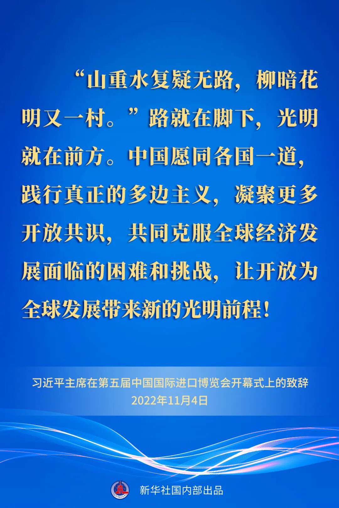 习近平最后强调,路就在脚下,光明就在前方。中国愿同各国一道,践行真正的多边主义,凝聚更多开放共识,共同克服全球经济发展面临的困难和挑战,让开放为全球发展带来新的光明前程!