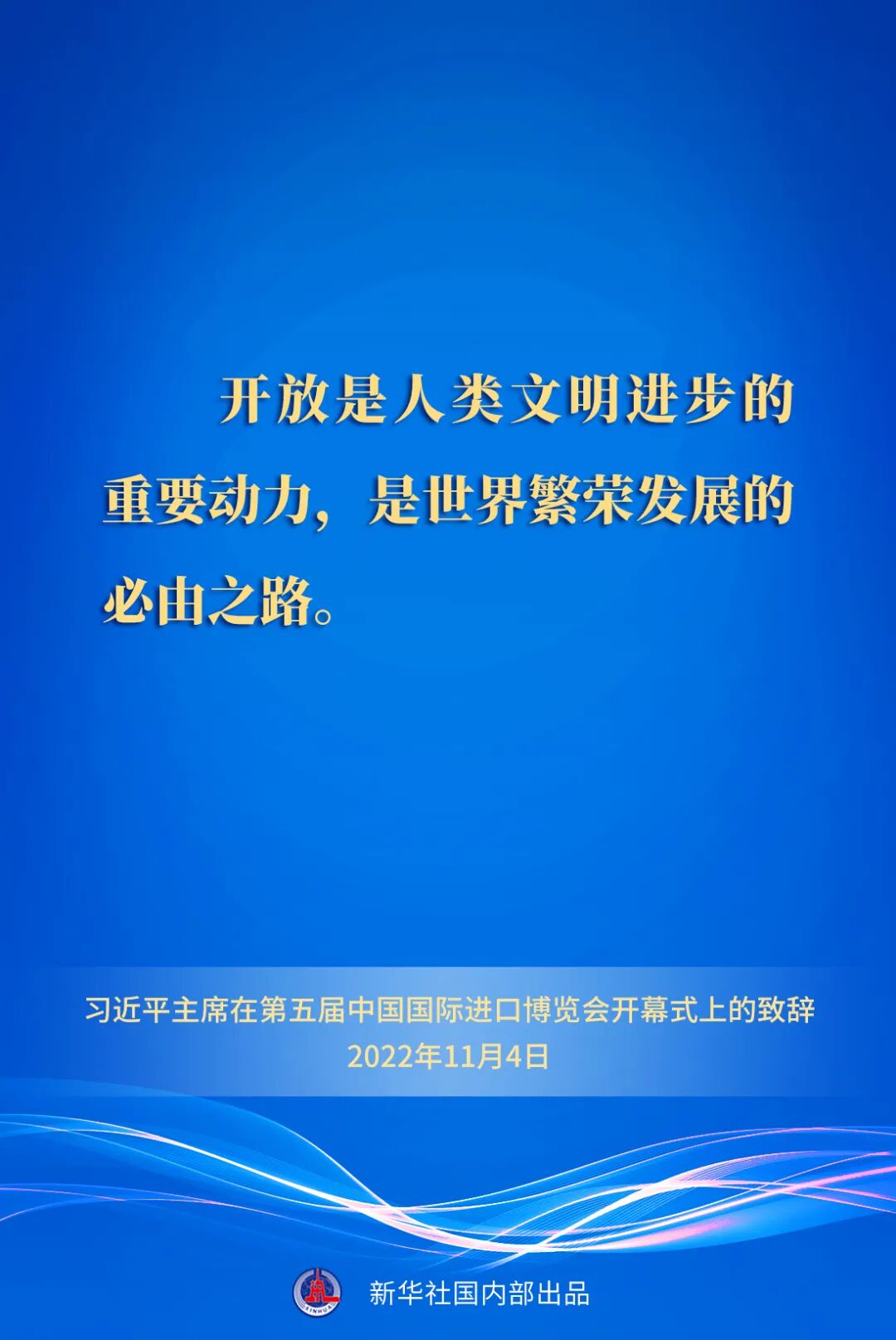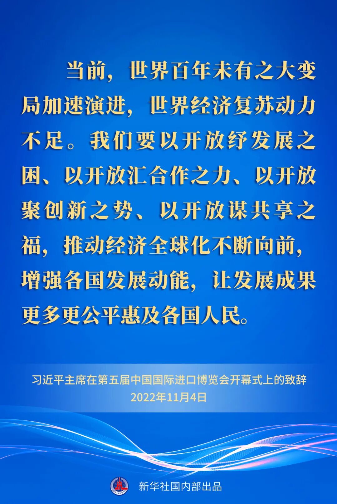 习近平强调,开放是人类文明进步的重要动力,是世界繁荣发展的必由之路。当前,世界百年未有之大变局加速演进,世界经济复苏动力不足。我们要以开放纾发展之困、以开放汇合作之力、以开放聚创新之势、以开放谋共享之福,推动经济全球化不断向前,增强各国发展动能,让发展成果更多更公平惠及各国人民。