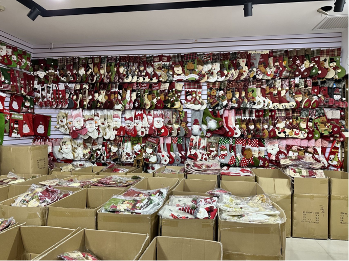 这里聚集了100多家专营圣诞用品的商户,但张兰芳的亿航圣诞用品店铺在其中仍然足够抢眼。店铺的两面墙挂满了各种款式的圣诞袜。