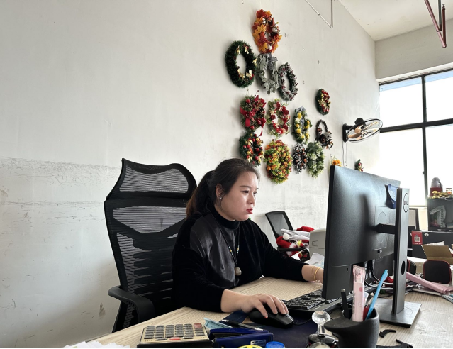 周秀英正在打印订单,身后墙上是公司的主打产品圣诞花环,作者拍摄
