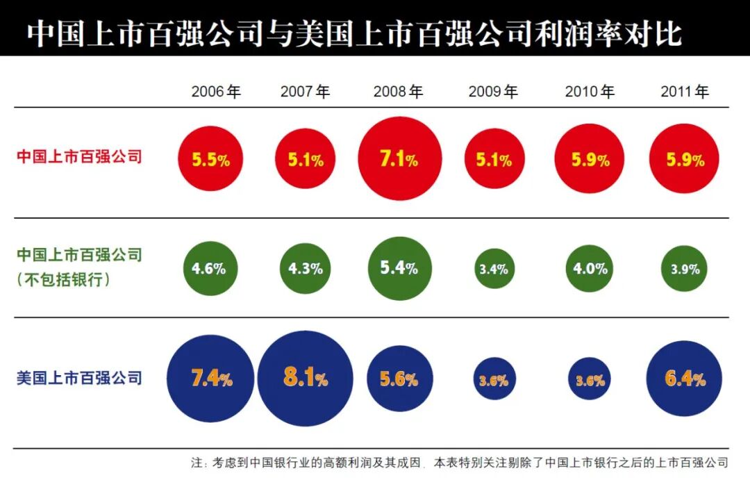 令人遗憾的是,企业规模的增长并未带来明显的绩效提升。从下图中可以看出,中国上市百强公司(如果不将利润奇高的银行包括在内)与美国上市百强公司的利润率存在巨大的鸿沟。而带来这种差异的,正是双方管理水平的显著落差。