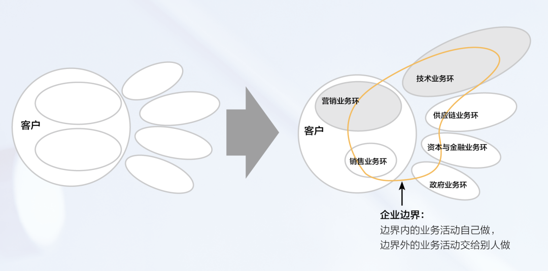 然后,根据自己企业的业务天赋,确定上述6个业务环中哪些业务活动自己做,哪些交给外部合作伙伴,划定好企业边界。