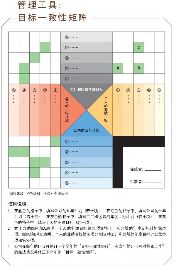 这个工具把PPG全球的目标、工厂和区域的年度目标以及个人的业绩目标等很直观地在一张图表上展示出来,不但能够把组织的目标从公司董事长一直传达到公司最底层的员工,告诉员工必须做什么,工作重点应该放在哪里,而且能够保证不同的分支机构能为共同的目标而努力。