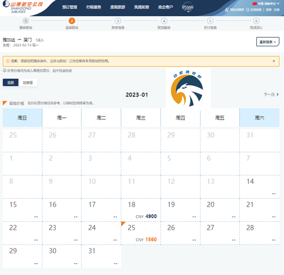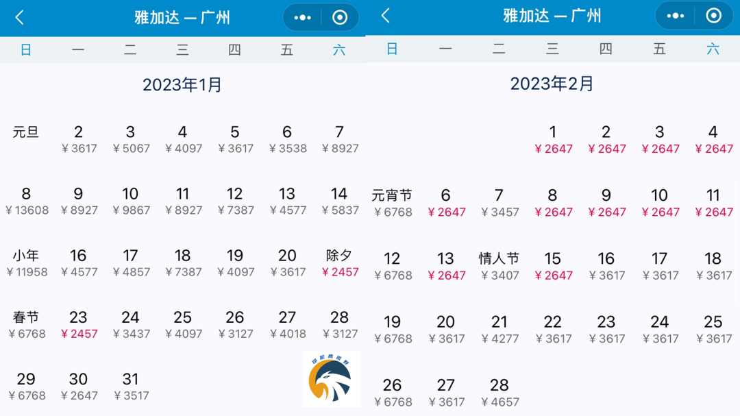 以下是一月、二月从印尼雅加达回国,各航司官方小程序上面的机票价格。