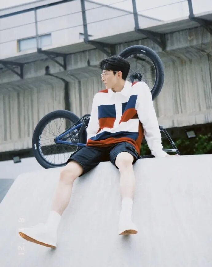 白敬亭玩 BMX 的 Polo 衫穿搭,条纹 Polo 来自伦敦设计师品牌 Daniel w. Fletcher,搭配 Stone Island 短款,脚穿 ZE by SANKUANZ x Goodbai 小白鞋,休闲风的体育生穿搭很受女生欢迎。