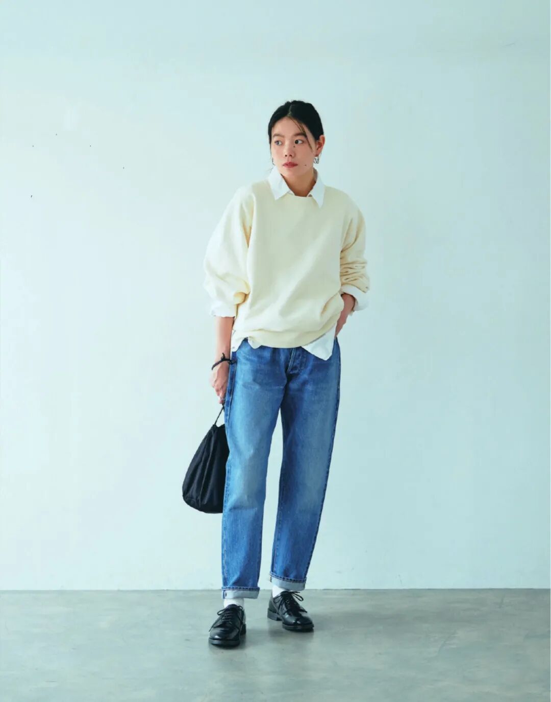 一条裤型优秀、蓝得亮眼的牛仔裤搭配棒球外套、棉质卫衣、羊毛质感的外套或者光滑硬挺的皮衣都非常合适。