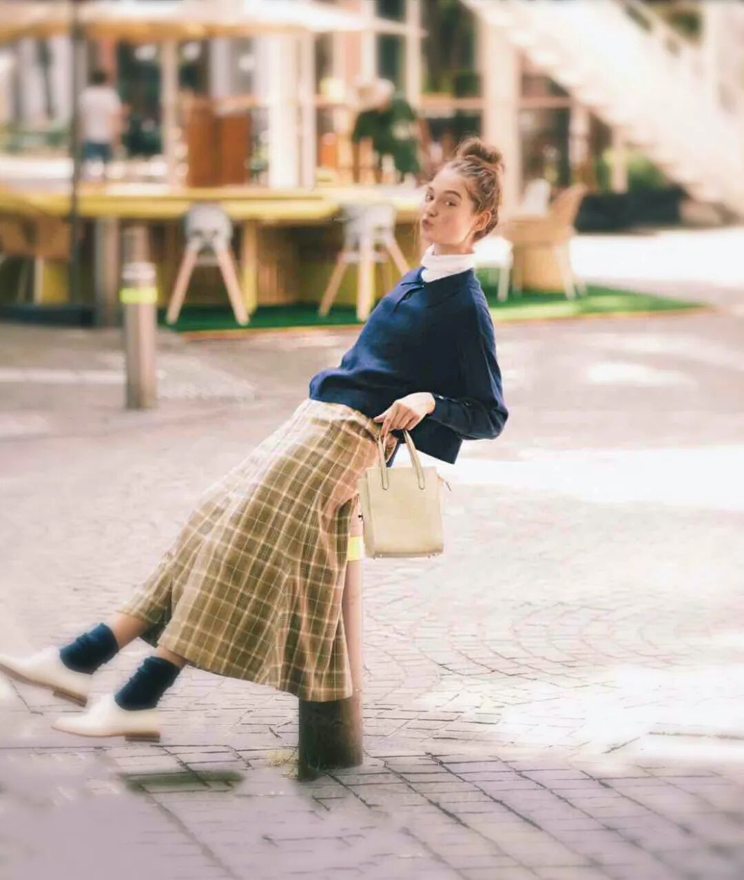 那么你可以选择白色提包、白色袜子等浅色配件增加穿搭细节,给秋冬天的 Navy 色系穿搭增加提亮一笔。