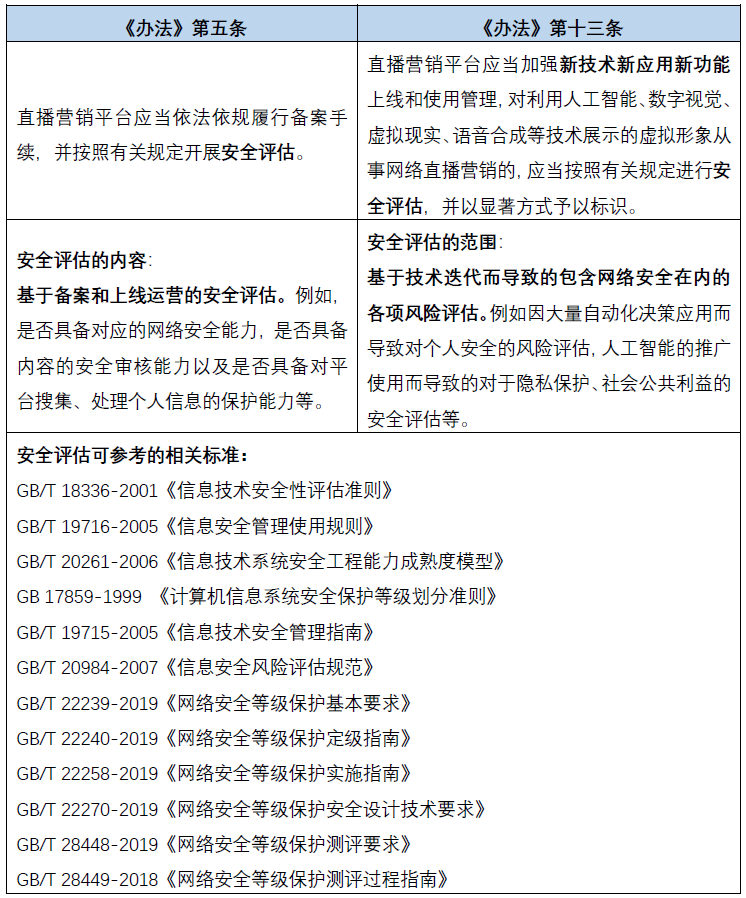 《办法》第五条与第十三条对直播营销平台提出了“按照有关规定开展安全评估”的义务。第九条第二款明确了平台的信息安全管理义务,要求平台加强对直播间内链接、二维码等跳转服务的信息安全管理,防范信息安全风险。信息安全风险防范与安全评估关系密切,对于整个直播间的信息安全而言,链接、二维码跳转的信息安全可视为其中的一部分。在跳转过程中,可能会引发信息泄露等风险,因此直播平台可在安全评估的过程中将该部分的功能予以考量和风险判断。结合《办法》的相关规定,笔者认为,两个条文中对安全评估范围和含义的侧重点明显不同。具体如下: