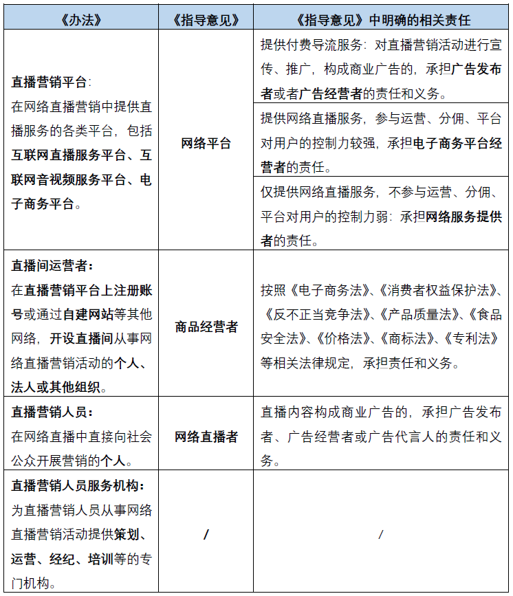《办法》第二条对直播营销环境下的各方参与主体予以明确,在电子商务环境下,网络直播营销活动中直接参与直播营销的主体与其他法律法规下规定的责任主体会存在相应的交叉与重合,例如直播营销平台与电子商务平台、广告经营者、网络服务提供者的身份重合;直播间运营者与平台内经营者的身份重合等。《市场监管总局关于加强网络直播营销活动监管的指导意见》(以下简称“《指导意见》”)中对不同主体之间的责任作出相应划分,结合《办法》的规定,笔者梳理如下: