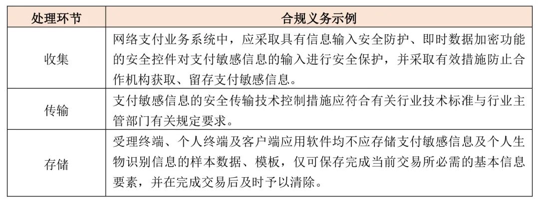 此外,个金技术规范还特别关注支付敏感信息,并在部分环节中针对性地设置了特殊合规义务。根据个金技术规范,“支付敏感信息”是指“支付信息中涉及支付主体隐私和身份识别的重要信息,具体包括银行卡磁道数据(或芯片等效信息)、卡片验证码(CVN 和CVN2)、卡片有效期、银行卡密码、网络支付交易密码等用于支付鉴权的个人金融信息。”由于其敏感性,支付敏感信息一般属于C3级别的个人金融信息,因此,除适用上述C3级别信息处理的一般合规要求外,处理支付敏感信息时还需履行以下的特殊合规义务: