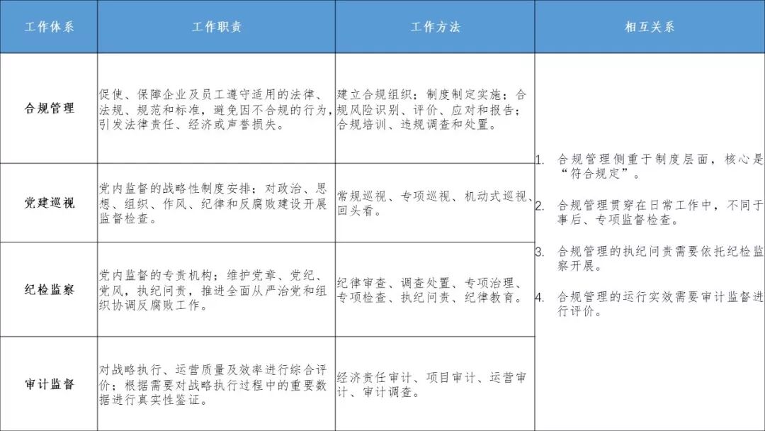 在实践中,合规体系建设和运行容易和党建巡视、纪检监察、审计监督等职能交叉覆盖。为了便于读者理清相关部门权责,我们初步整理了以上四种管理体系的工作职责、工作方法和相互关系。
